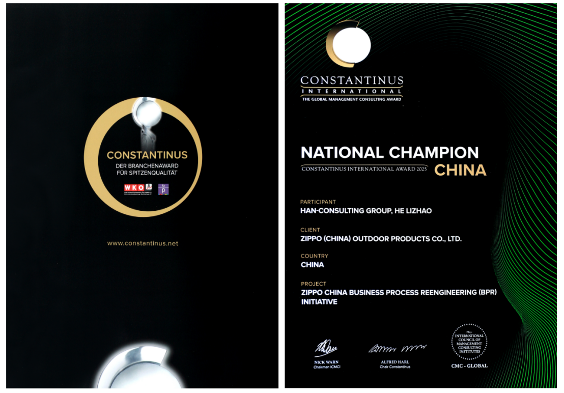 国际管理咨询协会理事会年会的高光时刻,即号称“咨询业界奥斯卡”的国际君士坦丁奖大奖发布及颁奖,每年都有来自20多个国家的数百个咨询案例竞逐。本届年会,汉哲咨询集团以《ZIPPO中国业务流程再造解决方案》项目脱颖而出,一举获得2025年度“君士坦丁奖”国家金奖,这也是本年度中国管理咨询界的唯一大奖。至此,2019年以来中国已有五家咨询机构获此殊荣,汉哲的这一成果也将与其他四个优秀案例一道,载入中国管理咨询行业的发展史册。
